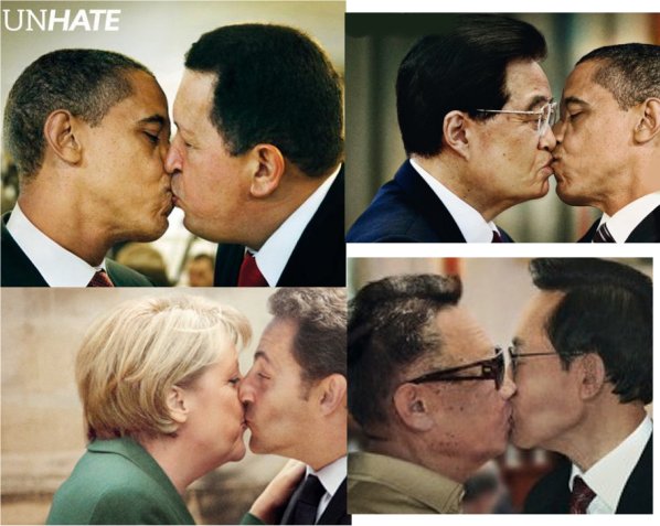 برخی از عکس های دستکاری شده دیجیتالی کمپانی بنه تون Benetton در اعلان خود. در این عکسها سران آمریکا و چین ، سران دولتهای فرانسه و آلمانی، اوباما و هوگو چاوز و نیز سران دو کره (شمالی و جنوبی) صمیمانه در حال بوسیدن یکدیگرند حال آنکه طبق اخبار، در معارضه اند.