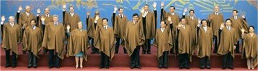 سران 21 گانه 21 نوامبر 2008 در شهر «ليما» با لباس محلي كشور « پرو Peru» موسوم به پونچوس Ponchos در كنار هم اين عكس يادگاري را گرفتند