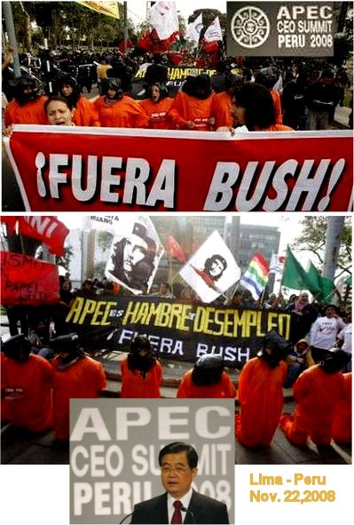 در جريان نشست دوره اي سران كشورهاي مجاور اقيابوس آرام كه 21 و 22 نوامبر 2008 در شهر ليما پايتخت «پرو» با شركت روساي جمهور چين، روسيه، برزيل، ژاپن، كانادا، مكزيك و ... و نيز ايالات متحده آمريكا برگزار شده بود در خيابانهاي آن شهر، تنها عليه جورج دبليو بوش رئيس جمهور آمريكا كه زمامداري اش در بيستم ژانويه آينده پايان خواهد يافت تظاهرات صورت گرفته بود. اصحاب نظر ضمن اشاره به اين تظاهرات و تظاهرات مشابه در عراق، پاكستان و نقاط ديگر گفته اند كه اين وضعيت بايد درسي باشد براي هر زمامدار و افرادي كه در آرزوي زمامدارشدن هستند كه از چنين سياست هايي دوري جويند و از مولفان خواسته اند كه «كتابهاي عكس» شامل تصوير مشكلاتي كه سياست هاي دولت بوش در هشت سال اول قرن 21 براي برخي از ملل بوجود آورده منتشر سازند و بر تصاوير گريه و شيون مادران داغديده عراقي، گدايان افغان، خرابي هاي گرجستان و پاكستان و ... تظاهرات مردم، كاريكاتورهاي مطبوعات و شعارهاي ديواري ضد بوش را هم اضافه كنند. در زير دو تصوير از تظاهرات «ليما» برضد شخص بوش آورده شده است. اين تظاهرات در حالي خيابانهاي ليما را دربرگرفته بود كه رئيس جمهور چين با آرامش تمام در حال سخنراني در نشست بود. تظاهركنندگان تصويرهاي «چه» انقلابي بزرگ و ضد امپرياليسم آمريكاي لاتين را با خود داشتند.