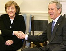 جمعه شب 13 ژانويه 2006 گزارشها، تفسيرها و مصاحبه هاي مربوط به قضيه اتمي شدن ايران بخش بزرگي از اخبار شبكه هاي تلويزيوني آمريكا را به خود اختصاص داده بود. اين گزارش ها با پخش مصاحبه مشترك جورج بوش رئيس جمهور وقت آمريكا و بانو «آنجلا مركل» رئيس دولت آلمان آغاز شده بود. در اين مصاحبه كه در پي مذاكرات سران دو دولت در كاخ سفيد انجام شده بود، جورج بوش گفت: ايران اتمي تهديدي براي امنيت جهان و به ويژه اسرائيل خواهد بود. وي افزود: كوشش من اين بوده است كه با همكاري سران ساير دولتها، براي مسئله اتمي ايران راه حل ديپلماتيك بيابيم. براي ما قابل قبول نيست كه ايران به اسلحه اتمي مجهز شود. من و «مركل» در قبال مسئله اتمي شدن ايران اتفاق نظر داريم و در آنچه كه بايد صورت گيرد تا از اين جاه طلبي جلوگيري شود متحد هستيم. ما همچنان موافق ادامه راههاي ديپلماتيك هستيم و با ارجاع قضيه به شوراي امنيت سازمان ملل وحدت نظر داريم. بوش گفت كه نمي تواند از هم اكنون پيشداوري كند كه چه تصميمي در شوراي امنيت گرفته خواهد شد و افزود: چون كار به اينجا رسيده است، ما هم اكنون در حال تبادل نظر و مذاكره با دولت هاي ديگر هستيم تا به يك استراتژي واحد دست يابيم. بوش گفت كه اعضاي شوراي امنيت با اقدام خود بايد به ايران پيام دهند كه رفتارش پذيرفتني نيست. بوش سپس به دادن پاسخ به پرسش هاي روزنامه نگار پرداخت و در پاسخ به يك سئوال كه آيا درست است که روابط آمريكا با آلمان در زمان حكومت شرودر چندان دوستانه نبود با كمي مكث گفت: بله. بوش سپس گفت ما و دوستانمان در آلمان منافع مشترك را درك مي كنيم و من از مساعي آلمان در كمك به آمريكا (درقبال مسئله ايران) سپاسگزار هستم. در اين مصاحبه مشترك، مركل به نوبه خود اظهارداشت كه ايران همه پيشنهادهاي ما و حتي روسيه را رد كرده و ما نبايد مرعوب دولت ايران شويم. شبکه هاي تلويزيوني درباره اظهارات جورج بوش به کسب نظر پرداخته بودند از اين قرار: