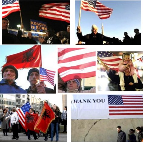 رديف بالا از راست به چپ: رقص دركوزوو درخيابان با پرچم آمريكا لحظه اي پس از اعلام استقلال يكجانبه اين سرزمين (مناره يك مسجد در فاصله دور در عكس ديده مي شود) ـ گروهي از مردم كوزوو درحالي كه پرچمهاي آمريكا را به دست دارند تابلوي «تولد كشور كوزوو» را بلند كرده اند. رديف مياني از راست به چپ: يك مهاجر كوزوويايي و كودكش در شهر برلين، با حركت دادن پرچم آمريكا از اعلام استقلال كوزوو ابراز خرسندي مي كنند ـ يك آلبانيايي در شهر تيرانا پايتخت آلباني پرچم آمريكا را برسر گرفته و ابراز پيروزي مي كند زيرا كه بيشتر ساكنان كوزوو آلباني تبار هستند. رديف پايين از راست به چپ: بر ديوار يك خيابان در شهر تيرانا (كشور آلباني) با نصب پرچم آمريكا، از اين دولت به خاطر اعلام استقلال كوزوو تشكر كرده اند ـ در پايتخت مقدونيه دو مرد آلبانيايي تبار مقدوني پرچمهاي آمريكا و جمهوري آلباني را به دست گرفته اند تا شادي خود را نشان دهند (به پيش بيني اهل نظر، استقلال كوزوو باعث ايجاد ناآرامي در مقدونيه كه يك اقليت آلبانيايي دارد خواهد شد)